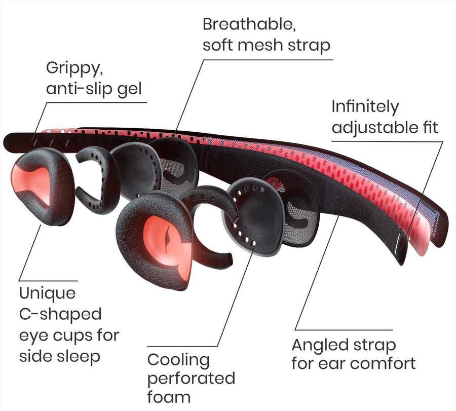 PRO’s eye cups feature a smart “air bubble” that expands to keep light out when switching positions, and compresses flat when you lie on your side. So you get a perfect blackout seal with none of the bulk.